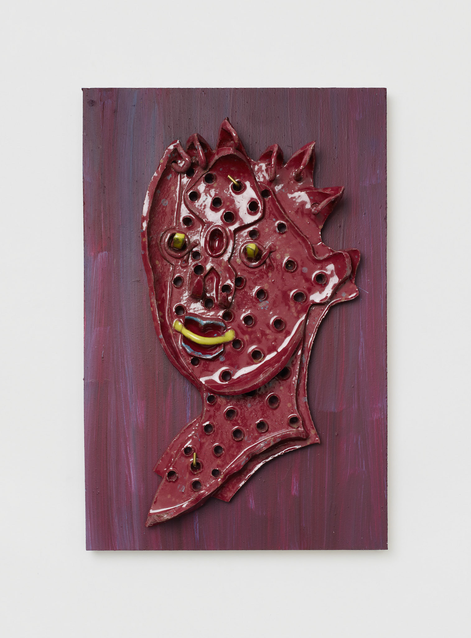 Kiki Kogelnik — Untitled (Face with spider) 1983 — Glazed ceramic on painted wood — 11 7/8 x 9 7/8 x 2 inches (30 x 25 x 5 cm)