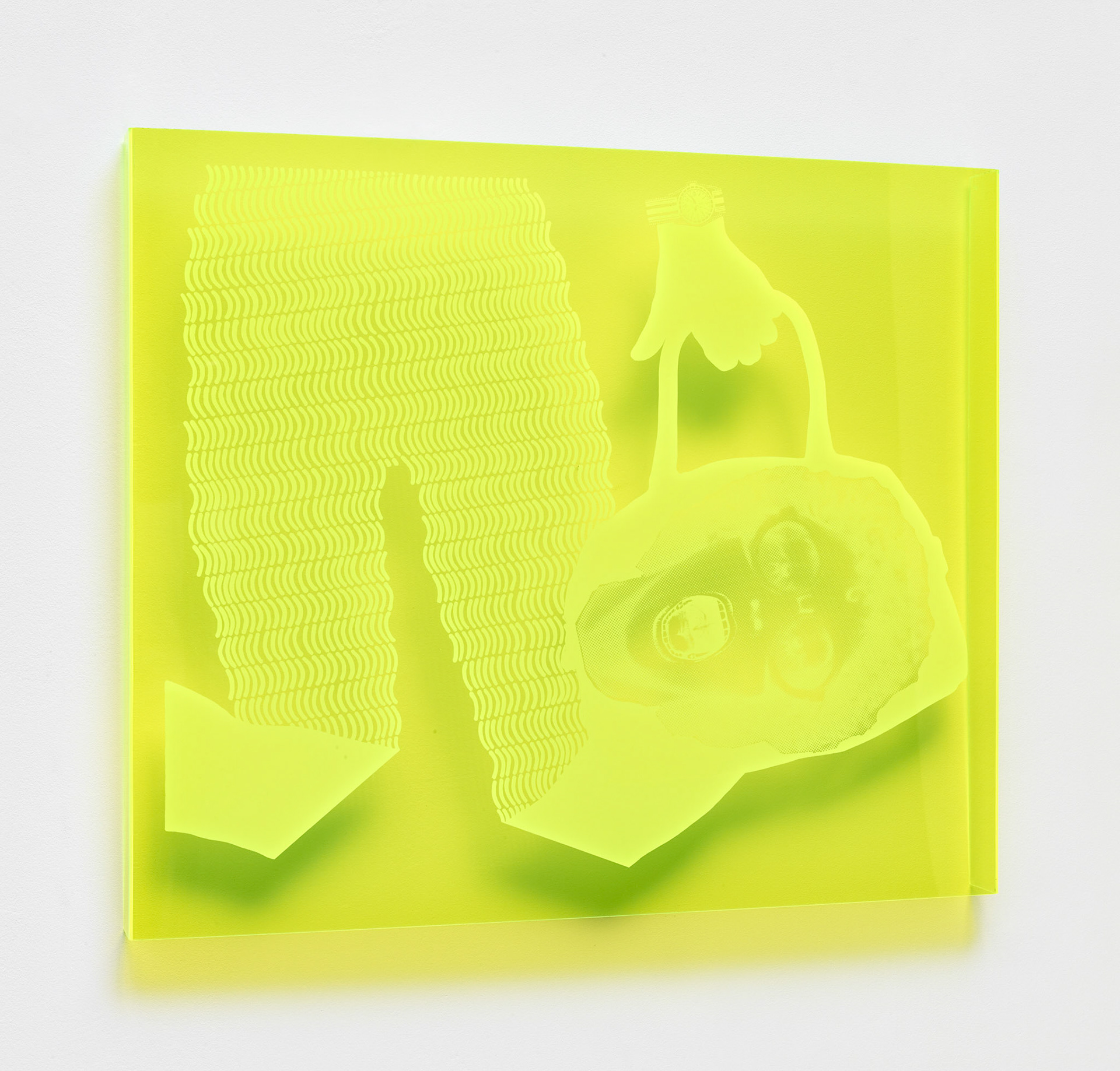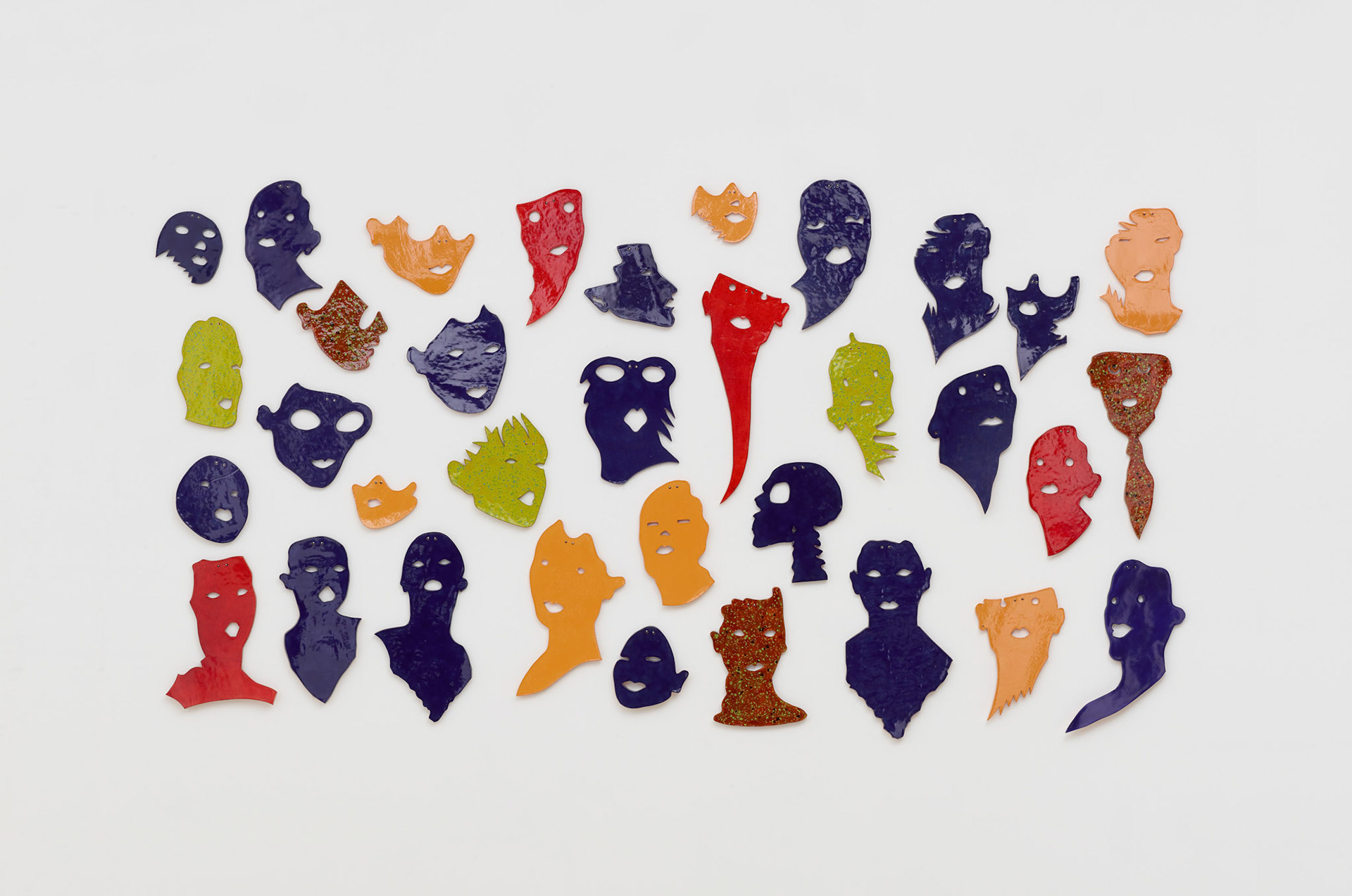 Kiki Kogelnik ! CG 09 1990 — Sheet vinyl-cutouts and paper on wood — 21 3/4 x 21 3/4 x 1 1/8 inches (55 x 55 x 3 cm)